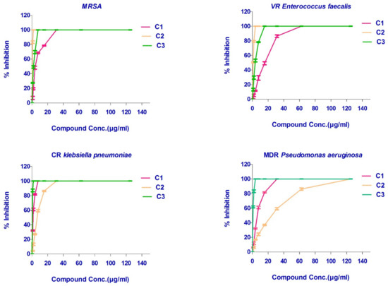 The three isolated and identified major phytochemicals were tested for their antibacterial activity. Dihydroauroglaucin (C1) was found to have wide antibacterial action with MICs equal to 7.8, 31.25, and 31.25 μg/mL against CR Klebsiella pneumoniae, MRSA, and MDR Pseudomonas aeruginosa, respectively. However, it exhibited moderate activity against VR Enterococcus faecalis (MIC = 62.5 μg/mL). On the other hand, isotetrahydroauroglaucin (C2) was more prominent against Gram-positive bacteria with MIC values of 1.95 and 3.90 μg/mL against MRSA and VR Enterococcus faecalis, respectively. It also exhibited moderate activity against CR Klebsiella pneumoniae (MIC = 31.25 μg/mL) and MDR Pseudomonas aeruginosa (MIC = 125 μg/mL). Furthermore, cristatumin B (C3) conveyed significant broad-spectrum antibacterial activity. The MIC values were 1.95 and 3.9 μg/mL against the resistant Gram-negative CR Klebsiella pneumoniae and MDR Pseudomonas aeruginosa, respectively. For Gram-positive VR Entero. faecalis and MRSA, MICs were 7.81 and 15.63 μg/mL, respectively (Figure 2 and Figure 3), (Table 3).