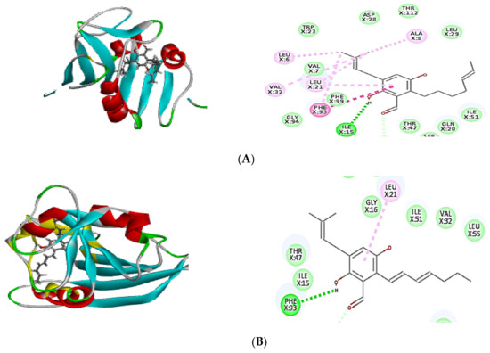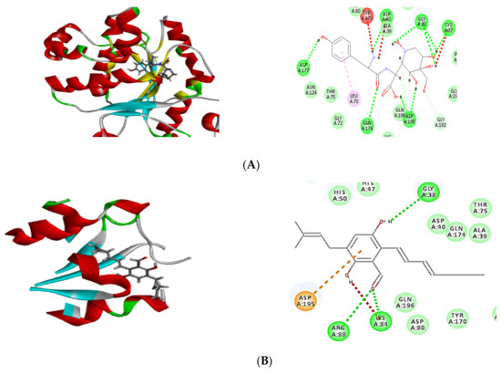 The realized antibacterial activities of the total extract, in addition to the three isolated compounds, may be related to the lipophilic properties. This can be observed through the π–alkyl interactions of the different tested compounds with the target site in the studied enzymes (Figure 4, Figure 5 and Figure 6). Moreover, hydrogen and ionic bonds with different amino acids were also recognized due to the presence of phenolic, alcoholic, and ketonic groups in the isolated phytochemicals. These bonds can effectively interact directly with proteins and consequently interfere with their 3D structure (conformation), resulting in inhibition of the activity [33].