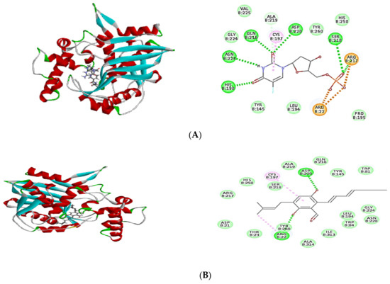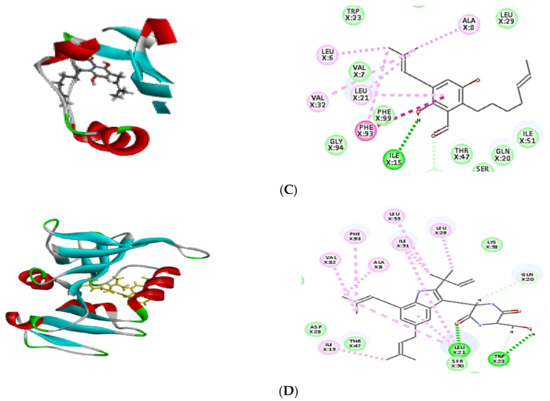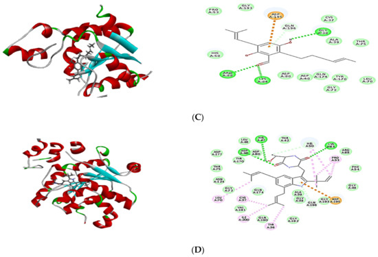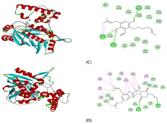 Two-dimensional (2D) and three-dimensional (3D) binding mode of the co-crystalized ligand (FFO) (A), dihydroauroglaucin (B); isotetrahydroauroglaucin (C); cristatumin B (D) with thymidylate synthase. Residues are labeled with their three-letter amino acid code and their location. Hydrogen-bonding interactions are depicted by a green dashed line between the receptor and the ligand, whereas π–alkyl interactions are represented by a purple dashed line.