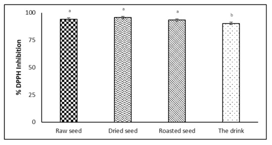 The antioxidant capacity reflects the capacity of bioactive compounds to maintain the nutritional and sensorial quality of the product. The highest capacity was observed for the dried seed (95.66 ± 0.566 RSA% DPPH inhibited), but the results registered for the crude and roasted seed were not statistically different (Figure 1). On the other hand, good antioxidant capacity was registered for the proposed drink; even if the roasted avocado seed powder represents 7% of its composition, its antioxidant capacity was 90.27 RSA% DPPH inhibited.