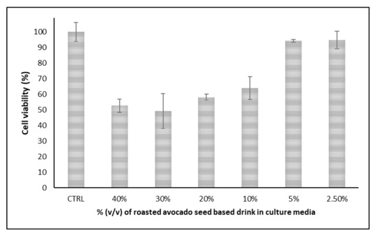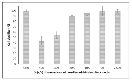 Cytotoxicity is considered an important aspect of any new food product or beverage which partially anticipates its health benefits upon consumption. Figure 2 and Figure 3 show the cell viability of the exposed cells to increasing concentrations of the novel roasted avocado seed-based drink.