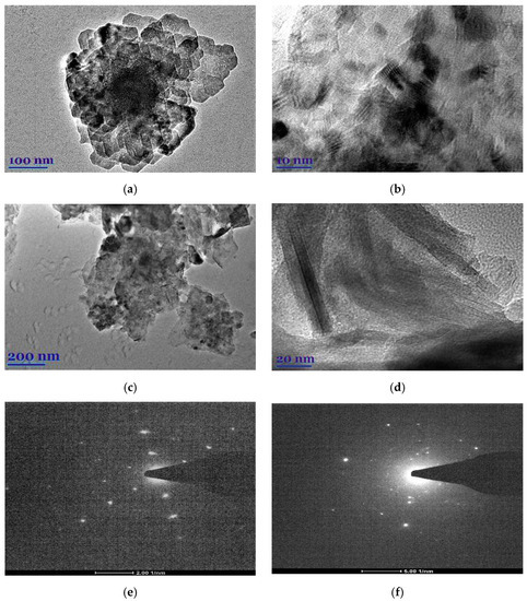 TEM images (a–d) and SAED (e,f) of E. globulus (a,b,e) and S. officinalis (c,d,f) patterns.