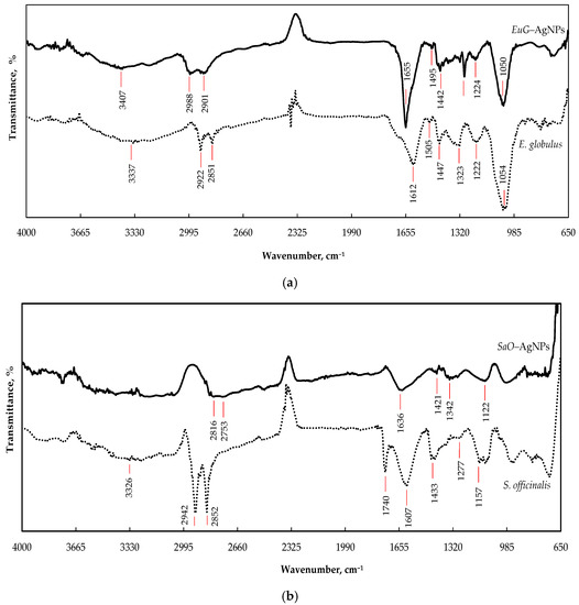 Some changes in the FTIR spectra of the biosynthesized EuG-AgNPs and SaO-AgNPs, such as the decrease in the absorption bands’ intensity, and their shifting or disappearing comparing to the absorption bands of the pure plant extracts, confirm the involvement of biomolecules of phytochemicals in the bioreduction, capping, and stabilization of AgNPs. The organic compounds such as flavanones or terpenoids may be responsible for the bioreduction of nanoparticles, whereas proteins can be involved in the stabilization of AgNPs [49]. It is believed that proteins can bind to AgNPs through free amine groups or cysteine residues in the proteins [56], whereas flavanones and terpenoids are absorbed on the surface of AgNPs, possibly by interaction through carbonyl [51,57,58]. It was determined that terpenoids reduce metal ions by oxidation of aldehydic groups in the molecules to carboxylic acid [57].