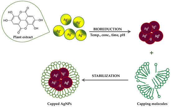 Although the process of biosynthesis of nanoparticles remains unclear, plausible mechanisms have been proposed to explain the formation of metallic AgNPs via bioreduction derived from plants [32,33]. Plants are rich in secondary metabolites, such as flavonoids, tannins, and phenolic acid. Many of these metabolites act as both reducing and stabilizing agents, and inhibit the aggregation of formed nanoparticles [32,59]. Generally, the Ag+ ions are inactivated via phytochelation, probably dye to the nucleophilic nature of the phenolic aromatic rings. It is supposed that ions are captured and immobilized by biological elements and subsequently undergo reduction, growth, and sintering processes, leading to the formation of AgNPs. Thus, the bioreduction of AgNPs by plant extracts can be divided into three phases [32]: (a) the activation phase, in which reduction and nucleation of Ag+ ions occurs; (b) the growth phase, when the small neighboring AgNPs combine to form larger particles, accompanied by an increase in the thermodynamic stability of the AgNPs; and (c) the termination phase, in which the final shape of the AgNPs is formed through (Figure 4).