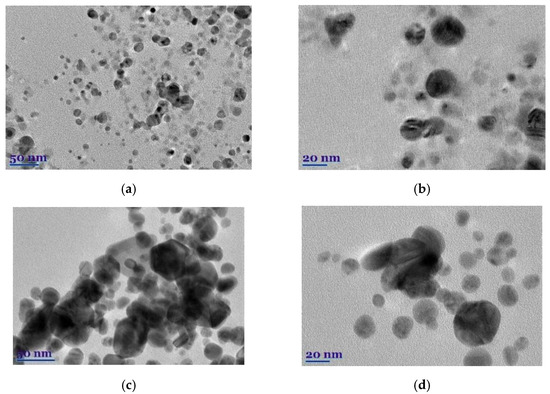 The morphology, shape, size, and chemical composition of biosynthesized EuG-AgNPs and SaO-AgNPs were examined by TEM and TEM-EDS. It is postulated that the type of plant extract and its concentration influence the morphology of the nanoparticles formed, whereas the temperature and pH of the extract medium controls the growth and size of the nanoparticles [32]. The shape, size, and morphology of green synthesized EuG-AgNPs and SaO-AgNPs are shown in Figure 5a–d. This shows that most of the nanoparticles are nearly spherical, whereas some of EuG-AgNPs and SaO-AgNPs have a triangular or hexagonal shape. A slight agglomeration of nanoparticles is also observed. After evaluating the particle distribution using the ImageJ application, it was found that the size of the nanoparticles depends on the plant extract used for bioreduction and stabilization. The diameter of the EuG-AgNPs was found to be in the range of 17.5 ± 5.89 nm (polydispersity approx. 4.5), whereas the SaO-AgNPs diameter is almost twice large and is in the range of 34.3 ± 7.76 nm (polydispersity approx. 6.0). The obtained results prove the suggestion that larger SaO-AgNPs show a UV-vis absorption peak at a longer wavelength (see Figure 2b).