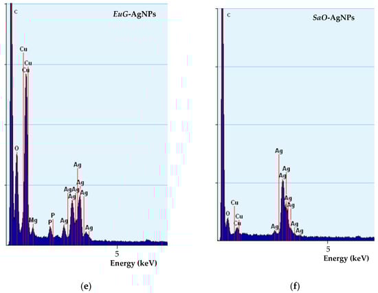 TEM-EDS spectra confirm the presence of biosynthesized nanoparticles (Figure 5e,f). EuG-AgNPs and SaO-AgNPs show a strong peak at approximately 3 keV, which is characteristic of metal silver due to LSPR [60]. In addition, other peaks for oxygen, carbon, and copper (from the TEM grid) were also observed.