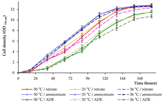 The high values of OD750 were noted at 136–184 h of the experiments, and the high specific growth rates were noted when the studied strain was cultivated in a modified medium with NH4Cl as the only source of nitrogen (compared to NaNO3-containing treatments and ADE-containing treatments). The growth curves, specific growth rate, doubling time, and biomass productivity in these experiments did not show significant differences at 30 °C, 33 °C, and 36 °C (within each block of experiments) (Figure 1 and Figure 2). Final OD750 nm and dry weight biomass values (when grown in the presence of NH4Cl or NaNO3) were also comparable, whereas volatile solids values obtained in treatments at 36 °C were lower compared to those received at other temperatures (Table 1). The growth of C. sorokiniana AM-02 in ADE-based medium demonstrated the lowest OD750 nm with the lowest values obtained at 36 °C (–16.4% on 184 h, when the maximum final OD750 values were compared) (Figure 1). Finally, the cultures increased in mean OD750 values and cell number to 10.70–12.80 and 3.7–4.2 × 108 cells mL−1, accordingly (depending on the treatment).
