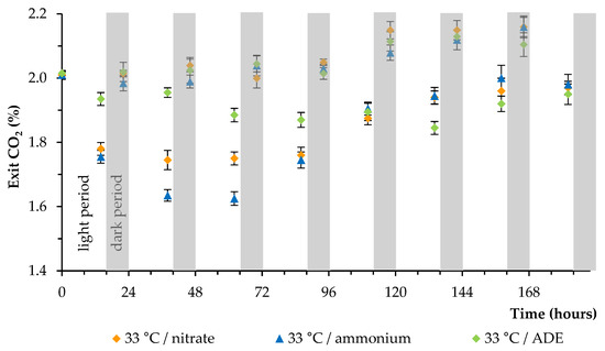In all experiments, the culture of microalga was continuously supplied with CO2 (800 mL of air containing 2.0% (v/v) CO2 per 1 min). A decrease and an increase in the CO2 level from the photobioreactor were observed during the light period and the dark period under all conditions, respectively (Figure 3 demonstrates data obtained at 33 °C). A higher level of initial carbon dioxide uptake by algal culture was observed when grown in BBM in the presence of NH4+. The lowest level of carbon dioxide uptake by alga was observed when grown in the ADE-based medium.