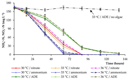 Anaerobic effluent is often characterized by a high content of ammonia, which accumulates during the anaerobic digestion process [23,26]. The nitrogen removal under different conditions is shown in Figure 4. The concentrations of NH4+-N and NO3−-N gradually decreased. The most effective nitrogen consumption was revealed in experiments with NH4+ in synthetic medium at all temperatures (30 °C, 33 °C, 36 °C). When cultivating microalga in ADE-based medium, a delay of NH4+-N consumption was observed (Figure 4), which affected the growth parameters and final biomass yield. The results obtained indicated that the temperature had no significant effect on the nitrogen removal (within each block of experiments); however, at 36 °C, the nitrogen consumption was slightly slower in all variants.