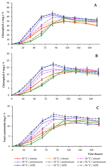 The content of chlorophyll a in cells increased from the day of inoculation to 88 h, reaching 68.1 and 58.9 mg L−1 at 36 °C in NH4+ and NO3−-containing media, respectively (Figure 5A). Chlorophyll b lines had similar patterns to chlorophyll a lines in these treatments, and its level reached 22.7 and 17.9 mg L−1 in NH4+ and NO3−-containing media, accordingly (Figure 5B). At lower temperatures, chlorophyll levels (when the same blocks of experiments were compared) were lower. After the maximum peaks, a decrease in the concentration of pigments was observed in all media containing different nitrogen sources.