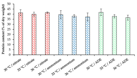 Considering that nitrogen is one of the main components of protein, we estimated the protein content in the cells of C. sorokiniana AM-02 cultured under different conditions (Figure 6). The cultivation of C. sorokiniana in synthetic media with NO3− and NH4+ allowed us to obtain a high biomass concentration containing up to 41.4% of protein, while in ADE-containing treatments, the final biomass concentration was lower, but the protein content was at the same level (maximum 41.8% of the dry weight). For microalgae of the genus Chlorella, the optimal cultivation temperature is in the range from 28 °C to 35 °C, above which the production of metabolites decreases [28]. Increasing the temperature up to 36 °C did not significantly affect the protein content in our experiments. This research indicates that C. sorokiniana AM-02 with high protein content can be suitable for animal feed application.