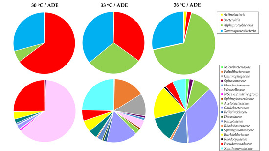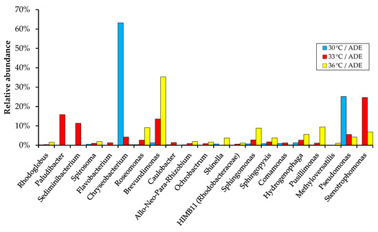 The composition of the bacterial communities was noted to be temperature sensitive. Thus, with an increase in temperature, the bacteria of the phylum Bacteroidetes were depleted and gave way to members of the phylum Proteobacteria, which are known to be either facultative anaerobic, aerobic, or even microaerobic [44]. On the class level, species of the Bacteroidia were abundant in the sample from 30 °C/ADE treatment (64.6%) and were important in 33 °C/ADE treatment (34.5%), whereas Alphaproteobacteria, which can survive on a minimal amount of nutrients, made up 67.6% of the community in 36 °C/ADE treatment (Figure 7).