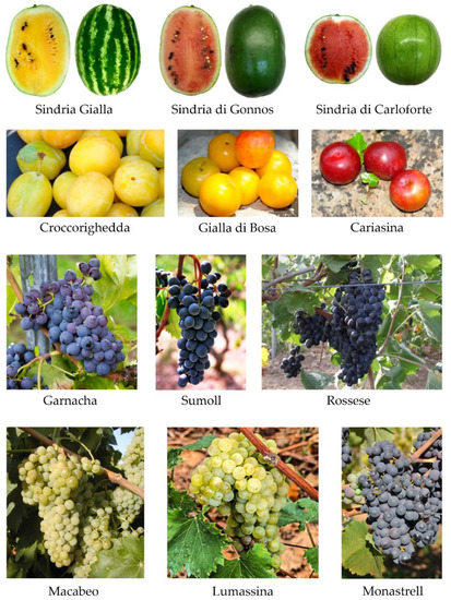 The following supporting information can be downloaded at: https://www.mdpi.com/article/10.3390/plants11081089/s1, Table S1: General inventory of Prunus domestica. I: Istituto di Scienze delle Produzioni Alimentari (ISPA); Table S2: General inventory of Citrullus. C: Comav Germplasm Bank; BG-SAR: Sardinia Germplasm Bank; S: Sassari University; B: Bari Germplasm Bank; A: Agenzia per la Ricerca in Agricoltura Regione Sardegna (AGRIS); Table S3: General inventory of Vitis vinifera subsp. vinifera. A: Agenzia per la Ricerca in Agricoltura Regione Sardegna (AGRIS), CR: CRA-VIT (Agricultural Research Council—Viticulture Research Centre), CI: CIEF (Centro para la Investigación y la Experimentación Forestal).
