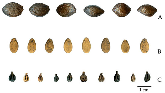 Representative image of some of the archaeological samples used in this work: (A) Prunus domestica; (B) Citrullus lanatus var. lanatus; (C) Vitis vinifera subsp. vinifera.