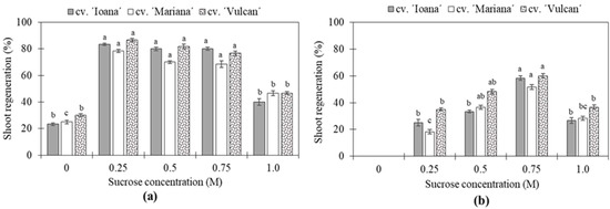 The sucrose concentration was critical for high regeneration frequencies even for non-cryopreserved shoot tips (Figure 2a), and the importance of concentration was more obvious after cryopreservation (Figure 2b). For all cultivars, significant differences for non-cryopreserved (−LMLN) shoot tips were noted for treatments with zero and 1.0 M sucrose (Figure 2a). The highest regeneration frequencies after cryopreservation (58% for ‘Ioana’, 52% for ‘Mariana’ and 60% for ‘Vulcan’) were obtained after 24 h osmoprotection in 0.75 M sucrose at 23 ± 1 °C in light conditions (Figure 2b). For cryopreserved shoot tips (+LN), the differences were significant within the same cultivar for the tested sucrose concentrations (Figure 2b). It was evident that PVS2 without previous osmotic dehydration in sucrose exerted harmful effects on shoot regeneration, obtaining regeneration rates between 33% (‘Mariana’) and 38% (‘Vulcan’) for non-cryopreserved (−LN) shoot tips (Figure 2a), whereas no regeneration was noted for cryopreserved (+LN) shoot tips in the absence of sucrose (Figure 2b).