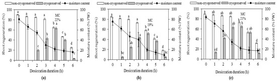 Shoot regeneration from alginate-coated non-cryopreserved (−LN) and cryopreserved (+LN) shoot tips according to the bead moisture content (MC) and the desiccation duration: (a) cv. ‘Ioana’, (b) cv. ‘Mariana’ and (c) cv. ‘Vulcan’. Osmoprotection was made in 0.75 M sucrose solution for 24 h at 23 ± 1 °C during a 16 h light photoperiod. The indicated MC values represent percentages leading to the highest regeneration rates for each cultivar. Vertical bars represent standard deviation. Different letters indicate significant differences (p ≤ 0.05).