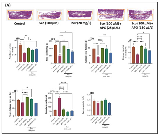 Zebrafish treated with imipramine (IMP, 20 mg/L), a tricyclic antidepressant [18] used as a positive control, exhibited high preference for the top zone of the tank (p < 0.001) (Figure 1B) and spent more time in the top of the tank (p < 0.00001) (Figure 1C,D) as compared to Sco alone-treated fish. In addition, IMP-exposed zebrafish displayed hyperlocomotion, as evidenced by the increased distance traveled in the top (p < 0.00001) (Figure 1E,F) and the decreased freezing duration (p < 0.00001) (Figure 1G) compared with the Sco-induced model. These results suggested that IMP had an anxiolytic profile. In comparison to the control group, Sco-treated zebrafish rarely approached the tope zone of the tank (p < 0.00001) (Figure 1B) and spent less time there (p < 0.00001) (Figure 1C,D). It is possible that Sco caused a lot of anxiety. Additionally, the Sco treatment had a hypolocomotor effect, lowering the distance traveled in the top (p < 0.00001) (Figure 1E) and extending the freezing time (p < 0.00001) (Figure 1G). Furthermore, APO treatment prevented the anxiogenic effect of Sco dose-dependently by increasing the number of entries in the tope zone of the tank (p < 0.01 for 150 μL/L) (Figure 1B), the time spent at the tope zone of the tank (p < 0.0001 for 25 μL/L and p < 0.01 for 150 μL/L) (Figure 1C), and the average entry duration (p < 0.00001 for 25 μL/L and p < 0.0001 for 150 μL/L) (Figure 1D) compared to the Sco alone-treated group. When compared to the Sco alone group, APO exposure prevented the Sco-induced hypolocomotor effect by increasing the distance traveled in the top (p < 0.0001 for 25 μL/L and p < 0.01 for 150 μL/L) (Figure 1E), the total distance traveled (p < 0.01 for 25 μL/L) (Figure 1F), and by decreasing the freezing duration (p < 0.00001 for 25 μL/L and p < 0.00001 for 150 μL/L) (Figure 1G). There were no noticeable effects on average velocity (Figure 1H).