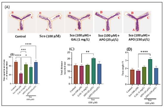 The effects of Sco (100 μM) and APO (25 and 150 μL/L) treatments on the Y-maze novelty response and locomotion are shown in Figure 2. Changes in swimming traces in the Y-maze are depicted in Figure 2A. It was shown that Sco administration resulted in reduced exploration of the novel arm in the Y-maze test, implying an impairment on a Y-maze response to novelty. The one-way ANOVA revealed a significant overall effect of the treatment in the Y-maze on the time spent in the novel arm (% of total arm time) (F (4, 45) = 11.05, p < 0.0001)) (Figure 2B), the total distance traveled (F (4, 45) = 4.44, p < 0.001)) (Figure 2C), and the turn angle (F (4, 45) = 10.56, p < 0.0001)) (Figure 2D).