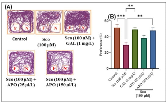 According to one-way ANOVA, the treatment had significant overall effects on preference percentages (F (4, 45) = 7.40, p < 0.0001) (see Figure 3). In the NOR test, zebrafish treated with GAL displayed a high preference for the novel object (N) (p < 0.0001) (Figure 3B) as compared to the Sco group. In comparison to the control group, zebrafish treated with Sco had reduced preference percentages for the N (p < 0.0001) (Figure 3B), implying impairment of recognition memory. Furthermore, APO treatment (25 and 150 μL/L) raised preference percentages in Sco-induced zebrafish (p < 0.001 for 150 μL/L) (Figure 3B), implying a memory-enhancing pattern.