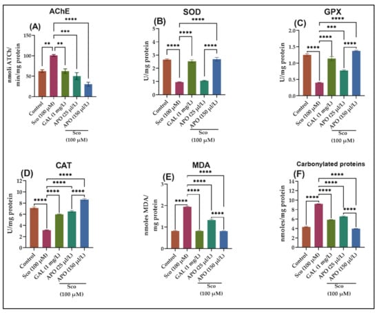 Figure 4. Effects of Angelica purpurascens essential oil (APO: 25 and 150 μL/L) on (A) AChE; (B) Superoxide dismutase (SOD); (C) Glutathione peroxidase (GPX) and (D) catalase (CAT)-specific activities; (E) malondialdehyde (MDA); (F) carbonylated protein levels. Data are represented by means ± S.E.M. (n = 10). ** p < 0.001, *** p < 0.0001, and **** p < 0.00001 (Tukey’s post hoc analyses). Galantamine (GAL, 1 mg/L) was used as reference positive drug.