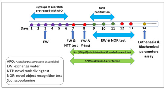 Treatment APO dosages [48] and Sco (100 µM) were chosen according to previous studies. APO (25 and 150 L/L) was diluted with 1% Tween-80 solution and given to zebrafish once daily for 13 days by immersion for 1 h, whereas Sco (100 µM) was given 30 min before each behavioral test. The control group was solely exposed to unchlorinated water containing a 1% Tween-80 solution. GAL and IMP were also given to the Sco-treated fish by immersion 30 min before the behavioral testing. The experimental design is outlined in Figure 6.