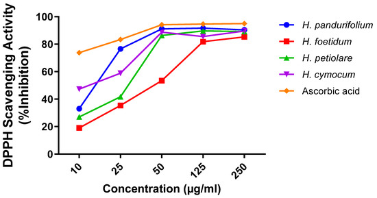 DPPH scavenging activity of aqueous acetone extracts of H. pandurifolium, H. foetidum H. petiolare, and H. cymocum.