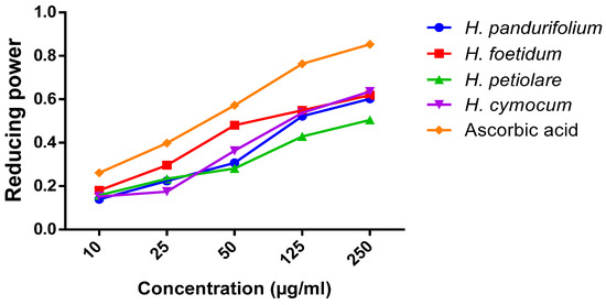 Reducing power activity of aqueous acetone extracts of H. pandurifolium, H. foetidum H. petiolare, and H. cymocum.