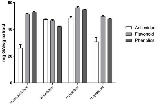 Figure 4 shows total antioxidant capacity (TAC) of H. pandurifolium (26.11 ± 3.38), H. foetidum (47.44 ± 0.41 mg/g), H. petiolare (48.50 ± 1.55 mg/g), and H. cymocum (30.82 ± 4.44 mg/g) extracts, respectively, while the flavonoid content was 51.65 ± 0.40 mg/g for H. pandurifolium, 46.59 ± 0.75 mg/g for H. foetidum, 56.19 ± 1.01 mg/g for H. petiolare, and 49.65 ± 0.74 mg/g for H. cymocum. On the other hand, the phenolic content was 53.11 ± 0.47 mg/g for H. pandurifolium, 42.14 ± 0. 50 mg/g for H. foetidum, 54.69 ± 0.23 mg/g for H. petiolare, and 47.93 ± 0.57 mg/g for H. cymocum acetone extracts, respectively. Overall, H. petiolare has the best antioxidant capacity, total flavonoids, and total phenolics compared with other species (Figure 4). Previous studies have shown that many factors, including genetic diversity, biological, environmental, seasonal variations as well as the harvesting period, may account for any differences or similarities seen in the results of TF, TP, and TAC of plant extracts for the same plant species [30,31,32].