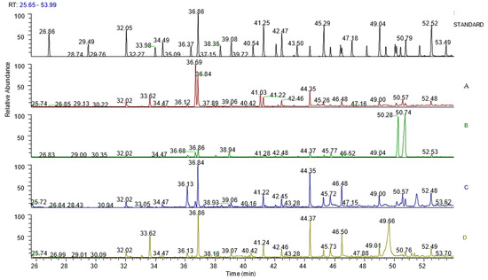 Shows the GC-MS chromatogram of the fatty acids of aqueous acetone extract of H.pandurifolium, H.foetidum H.petiolare, and H.cymocum with regularly labelled signals detected by the GC-MS detector. LEGEND: (A)—FAMEs chromatogram of H. pandurifolium; (B)—FAMEs chromatogram of H. foetidum; (C)—FAMEs chromatogram of H. petiolare; (D)—FAMEs chromatogram of H. cymocum.