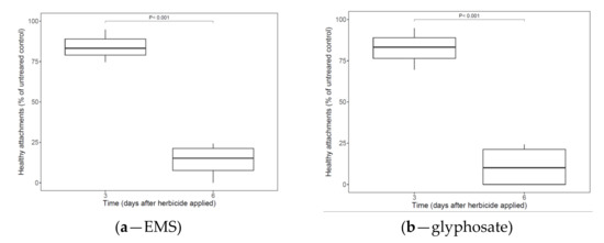 Healthy attachments of P. aegyptiaca compared with non-treated control in cabbage grown hydroponically in polyethylene bags. Ethametsulfuron-methyl (EMS, a) and glyphosate (b) were applied to the cabbage foliage after P. aegyptiaca attachment. Means were compared using a paired t-test (p < 0.05); the numbers in the figure represent p-values.