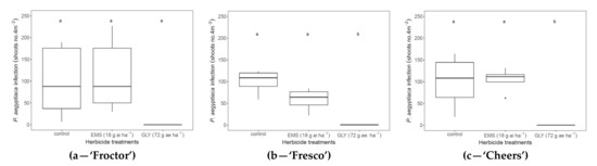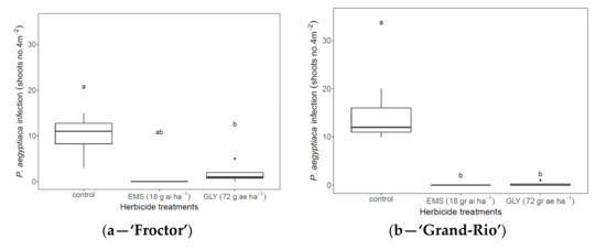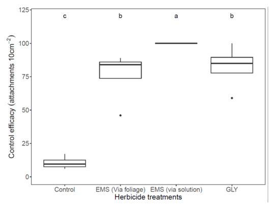 Control efficacy of P. aegyptiaca in cabbage grown hydroponically in polyethylene bags by applying the herbicide, glyphosate (GLY), or ethametsulfuron-methyl (EMS), before P. aegyptiaca attachment to the cabbage roots (vs. the non-treated control). Means were compared using GLM. (p < 0.05); means labeled with the same letter do not show significant differences.