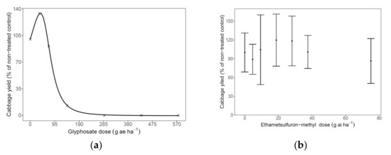 Sensitivity of cabbages to the herbicides glyphosate (a) and ethametsulfuron-methyl (EMS, b) applied sequentially on 21, 35, and 49 DAP. (a) A four-parameter modified sigmoid equation (for u-shaped hormesis) was fitted to the cabbage response to glyphosate; the parameters were as follows: upper asymptote (d = 100, SE = 0.74, p ≤ 0.0001), 50% of cabbage yield (X0 = 94.83, SE = 0.06, p ≤ 0.0001), and size of the hormesis effect (f = 11.63, SE = 0.38, p ≤ 0.0001). (b) Relationship between cabbage yield and EMS dose. Since there were no significant differences in the response of the cabbages to the various doses of EMS, a regression equation was not fitted.