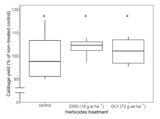 Cabbage sensitivity to the herbicides glyphosate (GLY) and ethametsulfuron-methyl (EMS). Herbicides were applied 21, 35, and 49 DAP at the doses of 72 g ae ha−1 glyphosate and 18 g ai ha−1 EMS. Means were compared using the Tukey HSD test (p < 0.05); means that are indicated with the same letter do not show significant differences.