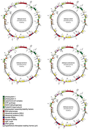 - Song, Y.; Zhang, Y.; Xu, J.; Li, W.; Li, M. Characterization of the complete chloroplast genome sequence of Dalbergia species and its phylogenetic implications. Sci. Rep. 2019, 9, 20401. [Google Scholar] [CrossRef] [PubMed]