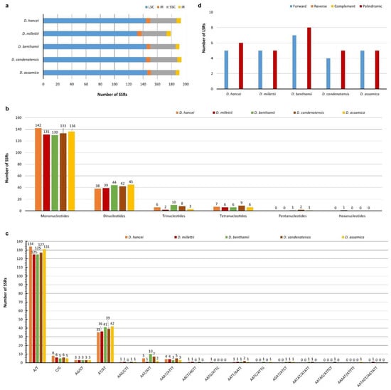 A total of 179–194 SSRs were identified in the five assembled Dalbergia cp genomes (Figure 2a). D. millettii has the smallest number of SSRs, while the rest have 191 or more. The LSC region has the highest number of SSRs ranging from 132 to 146 (73.74–76.44%), followed by the SSC region with 35–38 SSRs (18.32–19.59%) and the IR region with 5–6 SSRs (2.62–3.35%). However, if we take the length of each region into account, the SSC region has a higher SSR density (number of SSRs per nucleotide) (0.001824–0.001978) than LSC (0.001546–0.001712) (Table S2). Mononucleotide is the most common type of SSRs (130–142, average percentage 70.89%), followed by dinucleotide (38–45, average percentage 21.94%), trinucleotide (2–10, average percentage 3.06%), and tetranucleotide (6–9, average percentage 3.59%) (Figure 2b). Pentanucleotide is rare (1–2) and was only found in D. benthamii, D. candenatensis, and D. assamica. Only one hexanucleotide (AATACT/AGTATT) was detected exclusively in D. millettii. Same as other Dalbergia cp genomes previously reported [], SSRs of these five Dalbergia cp genomes are AT-rich. There are 125–134 A/T mononucleotide repeats and 35–42 AT/AT dinucleotide repeats but only 5–8 mononucleotide C/G repeats and 3 AG/CT dinucleotide repeats (Figure 2c). An AATG/ATTC tetranucleotide was only found in D. hancei. AATAG/ATTCT and AAAAT/ATTTT pentanucleotides were only detected in D. candenatensis and D. assamica, respectively. Complex repeat regions were analyzed with the REPuter algorithm (Figure 2d). Among the five chloroplast genomes, there are only 9–15 LSRs, with 4–7 forward repeats and 5–8 palindromic repeats. Reverse repeats and complement repeats were not detected. The largest repeat is a 287 bp sequence. There were two copies of this large repeat, one between the rpl23 gene and trnI-CAU gene and one in the ycf2 gene, in each IR region in all studied species. This repeat element is also present in other legumes, such as Glycine max, Lotus japonicus [], Phaseolus vulgaris [], and Lupinus luteus [].