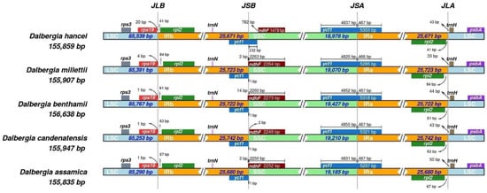 Comparison of the junction regions of the cp genomes of the five Dalbergia species. (JLB: junction between LSC and IRB; JSB: junction between SSC and IRB; JSA: junction between SSC and IRA; JLA: junction between LSC and IRA).