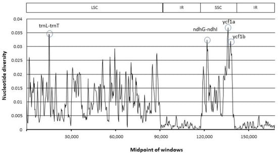 In the sliding window analysis, four regions with nucleotide diversity values (p ≥ 0.03) were identified as divergence hotspots (Figure 4). The most variable hotspot is ycf1a, (p = 0.037), followed by the trnL-trnT intergenic spacer (p = 0.035), ndhG-ndhI intergenic spacer (p = 0.032), and ycf1b (p = 0.032).