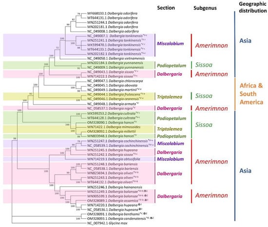 Dalbergia L.f. is a genus with pantropical distribution whose complete infrageneric classification is difficult []. The first attempt was made by George Bentham in A Synopsis of the Dalbergieae, a tribe of the Leguminosae in 1860 []. Based on geographical distribution and morphological evidence, he classified 64 species under six series and several subdivisions. David Prain contributed to the infrageneric classification of Asian Dalbergia in The species of Dalbergia of southeastern Asia []. He classified 86 species under two subgenera (Sissoa and Amerimnon), five sections (Triptolemea, Podiopetalum, Endespermum, Miscolobium, and Dalbergaria) and 24 groups, based on floral morphologies. In 1989, André de Carvalho published his treatment on Brazilian Dalbergia [,]. He classified 39 species with two varieties under five sections (Dalbergia, Triptolemae, Selenolobium, Pseudecastaphyllum, and Ecastaohyllum) based on the morphological evidence of reproductive organs []. However, molecular phylogeny based on ITS sequences do not match these treatments completely []. Hence, more molecular data are needed to facilitate the infrageneric classification of Dalbergia.