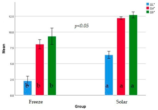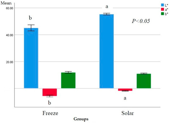 The change in color traits (ΔL*, Δa*, Δb*) calculated by the differences in the values before and after freeze- and solar- dried O. syriacum. Different superscript letters for the same color index of freeze- and solar- dried O. syriacum are significantly different (p ≤ 0.05).
