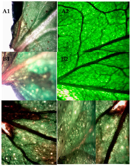 Microscopic pictures of za’atar leaves, (A1) fresh image near leave stem, (A2) fresh image near leave center, (B1) freeze-dried leave near stem, (B2) freeze-dried leave center, (C1) solar dried leave near stem, (C2) solar dried near center.