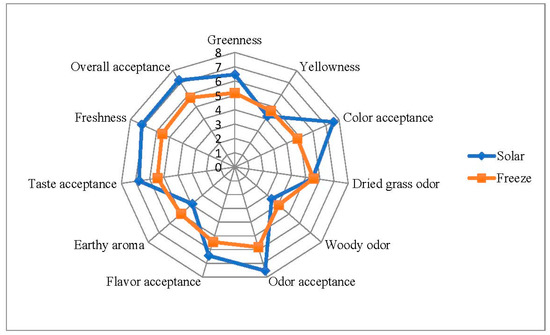 Mean score of sensory analysis for freeze-and solar-dried O. syriacum based on 11-point hedonic scale.