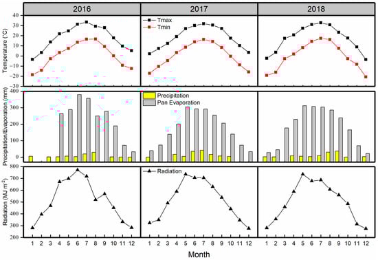Monthly maximum (Tmax), and minimum (Tmin) average air temperature (°C), precipitation (mm), pan evaporation (mm), and cumulative radiation (MJ m−2) at the experimental station in 2016–2018.