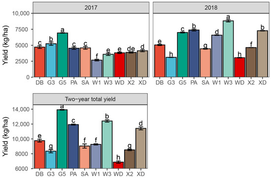 The annual yield of 10 alfalfa varieties in 2017 and 2018, and the two-year total yield. Different letters indicate means that are significantly different at p < 0.05. Error bars indicate the standard deviation of the means. DB: Derby, G3: Gannong No. 3, G5: Gannong No. 5, PA: Phabulous, SA: Sanditi, W1: WL168HQ, W3: WL343HQ, WD: Wudi, X2: Xinmu No. 2, XD: Xinjiang Daye.