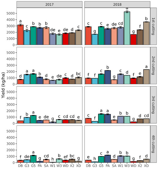 Forage yield for each cutting (1st to 4th) of 10 alfalfa varieties in 2017 and 2018. Different letters indicate means that are significantly different at p < 0.05. Error bars indicate the standard deviation of the means. DB: Derby, G3: Gannong No. 3, G5: Gannong No. 5, PA: Phabulous, SA: Sanditi, W1: WL168HQ, W3: WL343HQ, WD: Wudi, X2: Xinmu No. 2, XD: Xinjiang Daye.