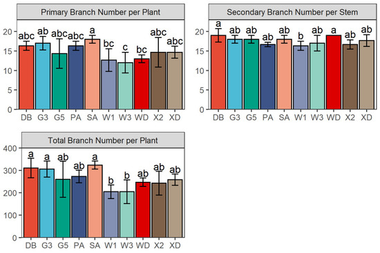 The Primary Branch number per plant (PB), Secondary Branch number per stem (SB), and Total Branch number per plant (TB) of 10 alfalfa varieties at the flowering stage before the first cutting in 2017. Different letters indicate means that are significantly different at p < 0.05. Error bars indicate the standard deviation of the means. DB: Derby, G3: Gannong No. 3, G5: Gannong No. 5, PA: Phabulous, SA: Sanditi, W1: WL168HQ, W3: WL343HQ, WD: Wudi, X2: Xinmu No. 2, XD: Xinjiang Daye.