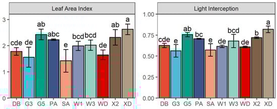Leaf area index (LAI) and light interception (LI) of 10 alfalfa varieties at the flowering (first cutting) in 2017. Different letters indicate means that are significantly different at p < 0.05. Error bars indicate the standard deviation of the means. DB: Derby, G3: Gannong No. 3, G5: Gannong No. 5, PA: Phabulous, SA: Sanditi, W1: WL168HQ, W3: WL343HQ, WD: Wudi, X2: Xinmu No. 2, XD: Xinjiang Daye.