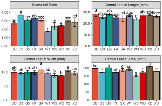 Stem/Leaf Ratio and central Leaflet Length, Width, and Area at flowering (first cutting) in 2017. Different letters indicate means that are significantly different at p < 0.05. Error bars indicate the standard deviation of the means. DB: Derby, G3: Gannong No. 3, G5: Gannong No. 5, PA: Phabulous, SA: Sanditi, W1: WL168HQ, W3: WL343HQ, WD: Wudi, X2: Xinmu No. 2, XD: Xinjiang Daye.