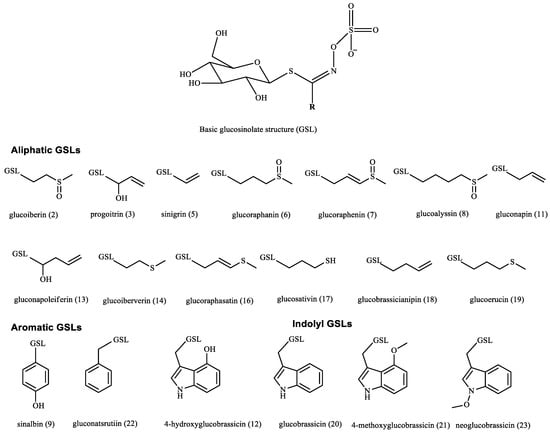 - Blažević, I.; Montaut, S.; Burčul, F.; Olsen, C.E.; Burow, M.; Rollin, P.; Agerbirk, N. Glucosinolate structural diversity, identification, chemical synthesis and metabolism in plants. Phytochemistry 2020, 169, 112100. [Google Scholar] [CrossRef] [PubMed]