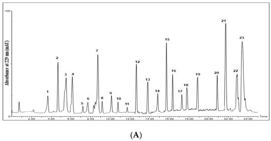 The analysis was carried out using a 1260 HPLC system (Waters Corporation, Milford, MA, USA) coupled with a PDA detector (set at 229 nm). Sample solutions (100 μg/mL each) were prepared using HPLC analytical grade methanol, filtered through a membrane disc filter (PTFE, 0.2 μm), and degassed by sonication before injection. Samples (injection volume, 10 μL) were introduced to a reverse phase C18 column (ACQUITY UPLC-BEH C18, 1.7 µm particle size, and 2.1 × 50 mm column, Waters Co., USA). Gradient elution was performed using two eluents at a flow rate of 0.2 µL/min: eluent A (100% ultrapure water) and eluent B (100% acetonitrile). Elution was performed according to the following gradient: 10% B (0–10 min), 10–30% B (11–20 min), and 1% B (21–30 min). Peaks and relative peak areas were tentatively identified by comparison with authentic GSL standards, which were desulfated using the same previously mentioned procedure. Serial concentrations of each standard GSL (10–20 µL/mL were used to establish the standard calibration curve. The amount of desulfo-GSL was expressed as µmol/gm DW (dry weight) []. GSL names were given according to the standard recommended nomenclature method [].