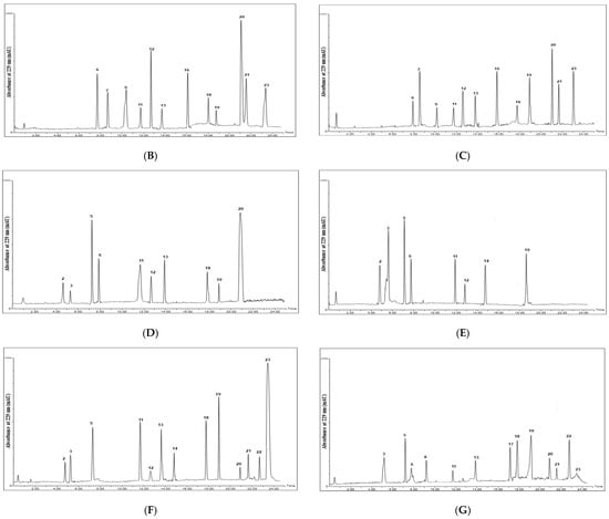 Chromatograms of desulfoglucosinolates in the standard glucosinolate mixture (A) and the alcoholic extracts of the tested seeds. (B) Raphanus raphanistrum L. (C) Raphanus sativus L. (D) Brassica oleracea var. botrytis L. (E) Brassica oleracea var. capitata L. (F) Brassica rapa L. (G) Eruca sativa L. Numbers on charts indicate names of corresponding glucosinolates, which are given.